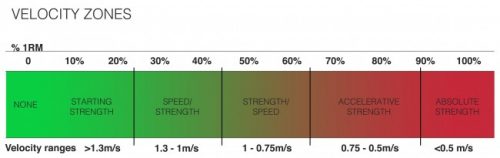 A pesar de ser una modalidad de entrenamiento diferente al PBT, el entrenamiento basado en la velocidad puede seguir con bastante precisión los esquemas de periodización basados en porcentajes a través de las zonas de velocidad. Los investigadores González-Badillo et al. encontraron una correlación extremadamente alta entre el porcentaje del 1RM y la zona de velocidad correspondiente [12]. A continuación se muestran, extraídos del libro Developing Explosive Athletes del Dr. Bryan Mann, los porcentajes junto con las zonas de velocidad y siguiendo el Continuo de Fuerza de Bosco. Esto se explicará con mucho más detalle en una próxima publicación [9].