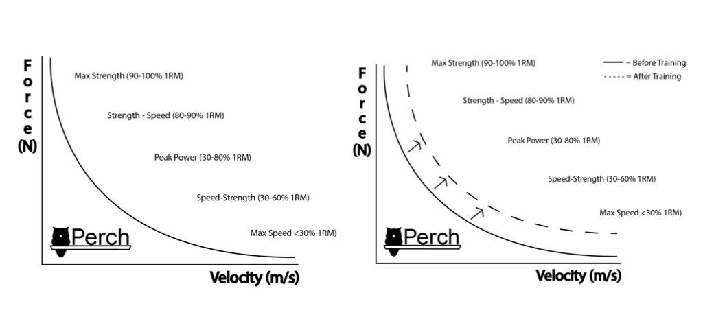 - Por lo general, a medida que la fuerza disminuye, la velocidad aumenta. Lo ideal es que esta curva se desplace hacia la derecha a medida que el deportista va adquiriendo mayor destreza a lo largo de cada ciclo de entrenamiento. La curva de la izquierda es la «ideal» y se desplazaría hacia la derecha con el entrenamiento, tal y como muestra la curva de la derecha. Los deportistas con fuerzas variables pueden presentar una curva asimétrica, lo que deja margen de mejora en algunas áreas más evidentes que en otras (recuerde los cubos). Es habitual trabajar en todas las zonas de velocidad periodizadas a lo largo de un plan anual; con acceso regular a estos datos, también podemos ayudar al deportista a mejorar en áreas específicas para las necesidades de su deporte.